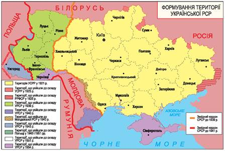 Остаточно обриси повоєнних кордонів УРСР сформувались у процесі україно-польського, україно-чехословацького, україно-румунського територіальних розмежувань та юридичному закріпленні західноукраїнських земель, що увійшли до складу УРСР протягом 1939-1945 р.