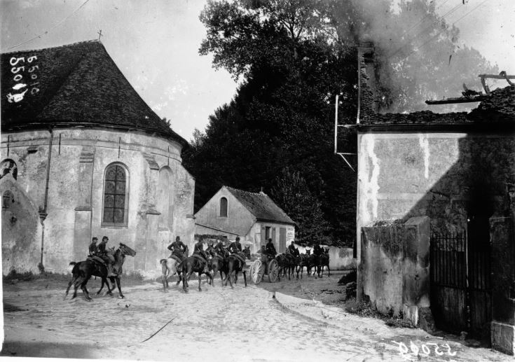 Німецькі солдати (у характерних шоломах пікельгаубе з тканинними чохлами) на фронті під час Першої битви на Марні під час Першої світової війни, зроблене у вересні 1914 року. Джерело: wikipedia